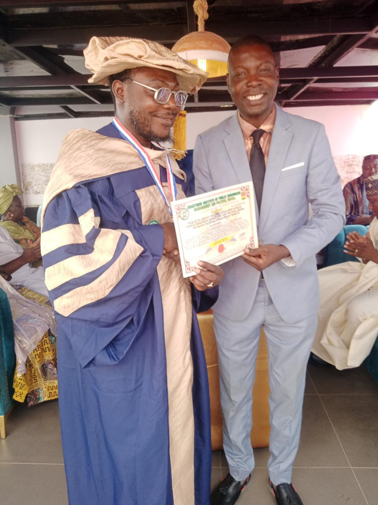 Team@orientaactualmags.com reports that Hon Makanjuola Yahaya Lanre Darosa received the honorary doctorate fellow at an investiture ceremony presided over by Dr Seye Philips, Executive Director, CIPRMP, West Africa and Mr Lanre Sadiq, Head of Nigerian Correspondence office at the Top & Glaz, Warah Road, Ilorin, Kwara State on Sunday.